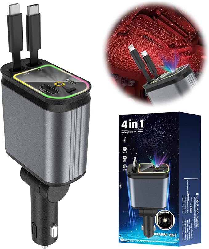 Su diseño compacto encajará perfectamente en tu auto e incluye 2 cables ajustables (para iPhone y Android).