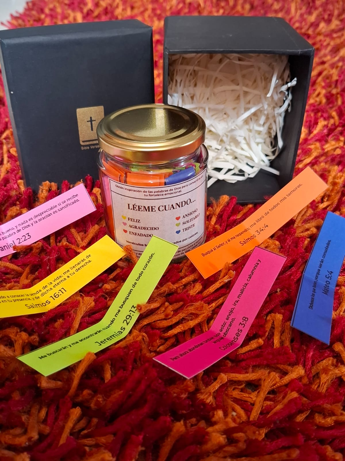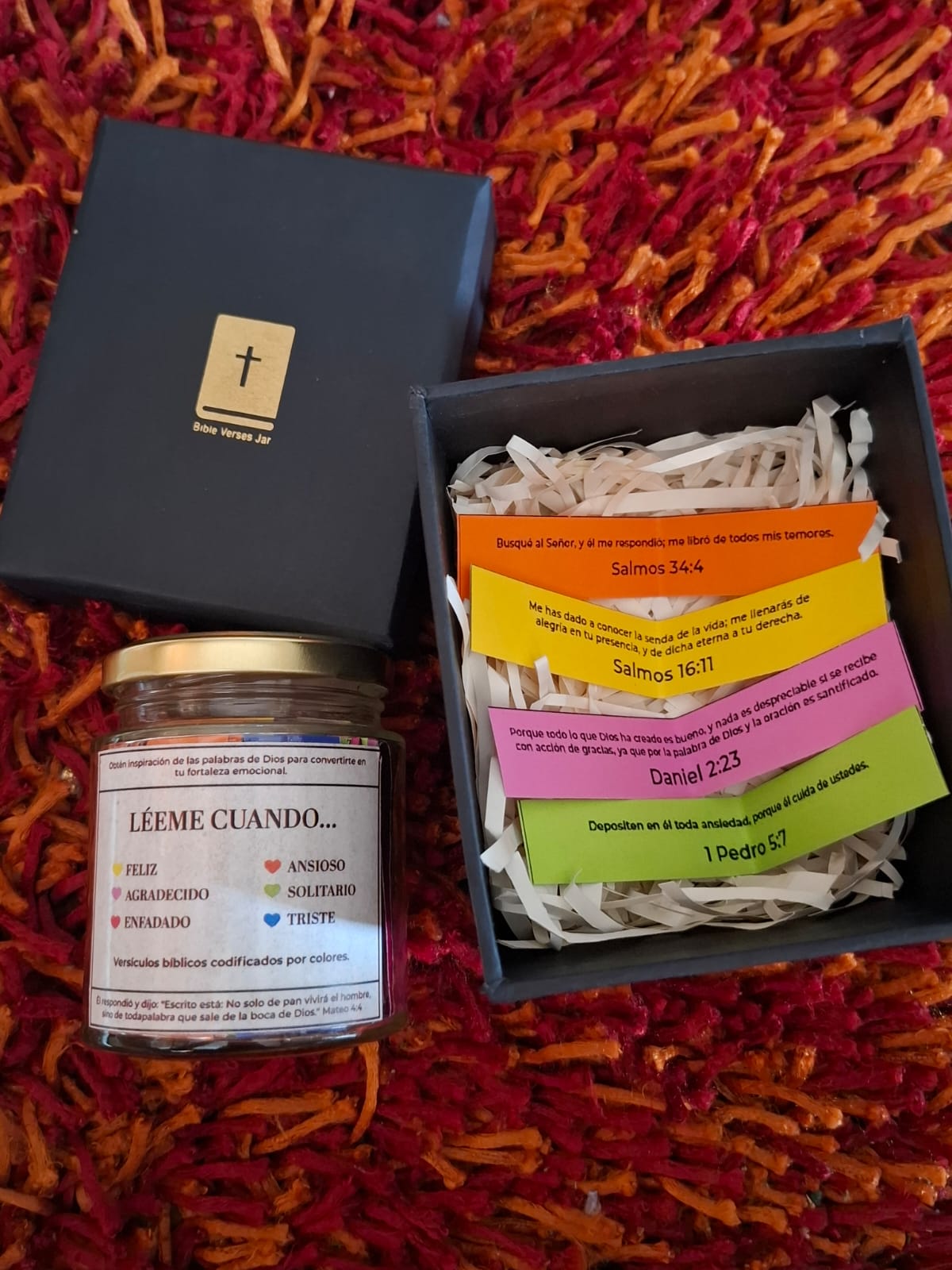 📖 "Este frasco contiene palabras de amor divino, porque Dios siempre tiene algo especial para ti. 'Él te lleva en la palma de su mano' (Isaías 49:16)."
